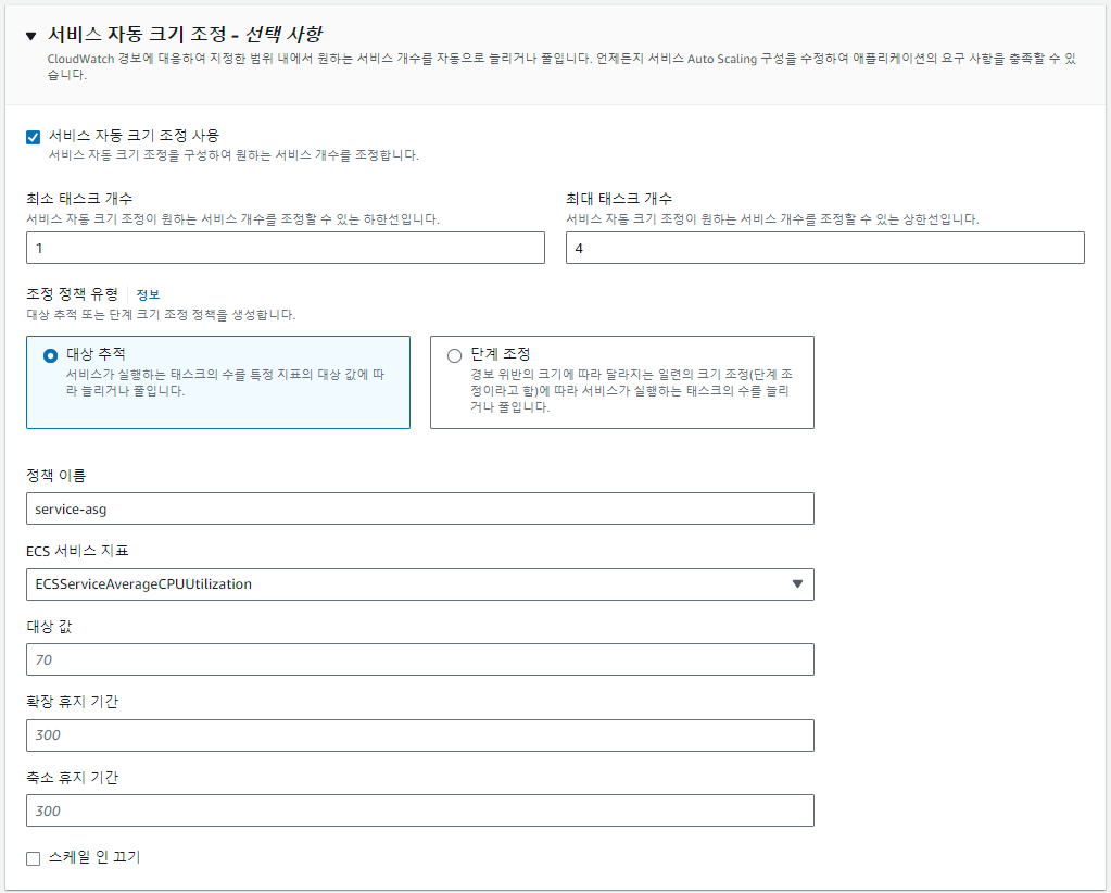 추가 옵션으로 서비스 자동 크기 조정(Auto Scale)을 지정하여 Fargate에 부하가 발생할 때 Scale Out 후 부하 감소 시 Scale In을 설정할 수 있습니다.