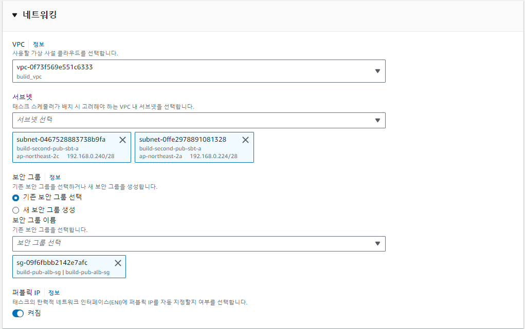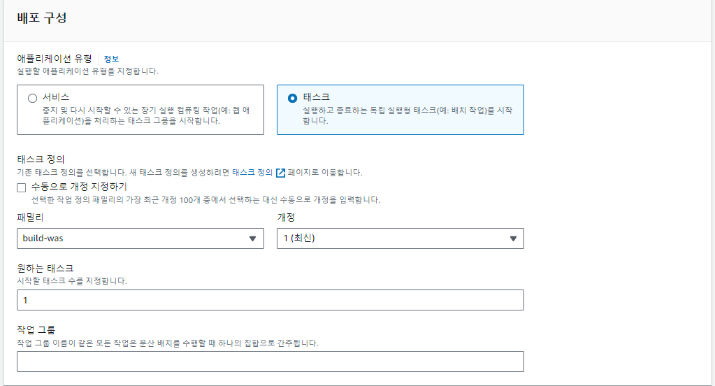 아래 배포 구성에서 "패밀리"항목이 내가 위에서 생성한 태스크 정의(TASK Definition)을 지정하고, 해당 TASK(Fargate)가 내가 구성한 VPC에서 동작하기 위해 네트워킹도 적절하게 구성해 줍니다.