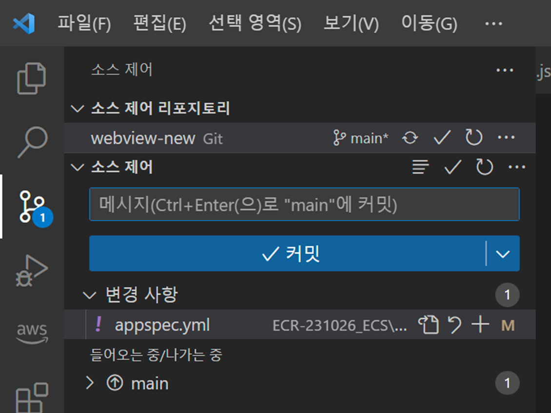 위 내용처럼 HTTPS를 통한 Git 연동을 통해 내 로컬PC소스와 CodeCommit 리포지터리에 엑세스합니다. 내 로컬PC소스는 Visual Studio Code를 이용하는데, 여기에서 작업하던 프로젝트의 소스 변경을 하게 되면 Git에서 변경을 감지하여 CodeCommit 브랜치(Main 또는 Master)로 커밋을 하라고 알려줍니다.