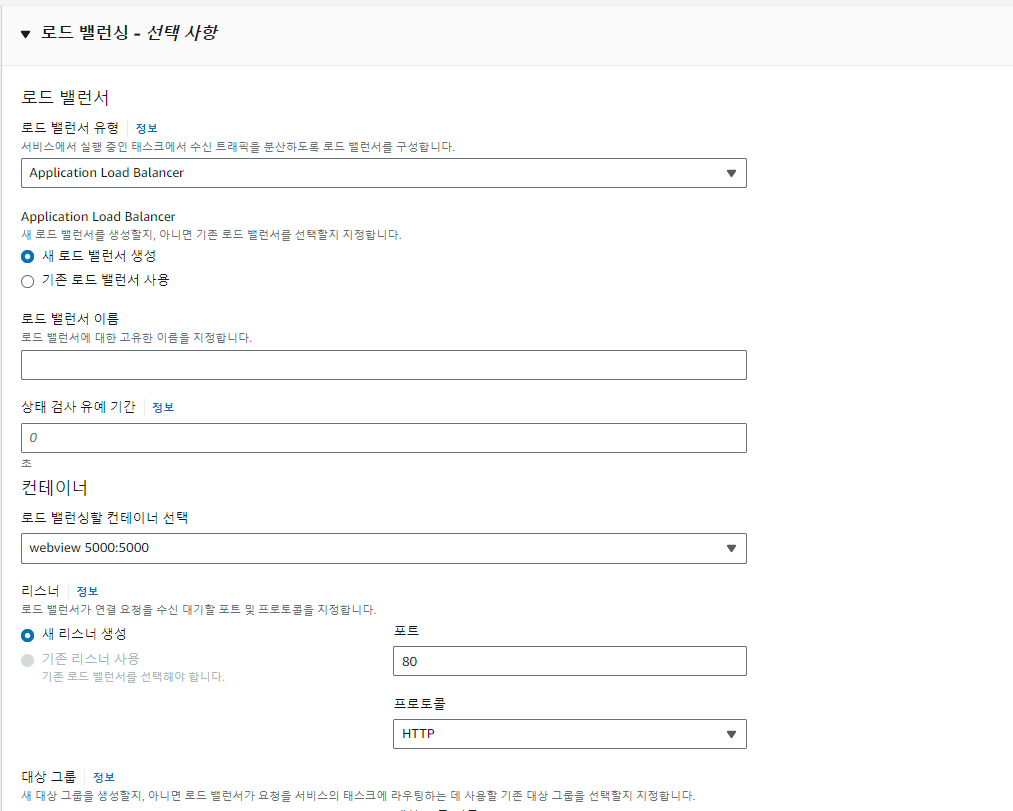 이 로드밸런서는 나중에 CodePipeline을 통한 배포 작업 시 블루/그린 또는 롤링 배포 시 자동으로 적절하게 대상(Target)을 변경하여 서비스 연속성을 가져갑니다.