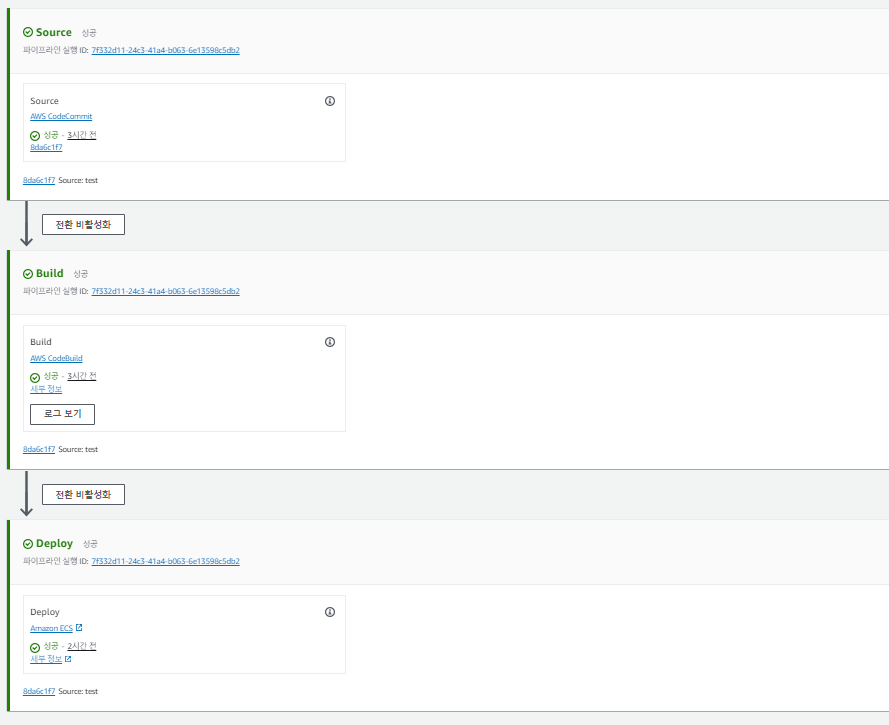 이제 Visual Studio Code에서 작업하던 소스를 변경하여 Commit & Push를 하고 CodePipeline을 보면 자동 배포가 이루어지는 것을 볼 수 있습니다.