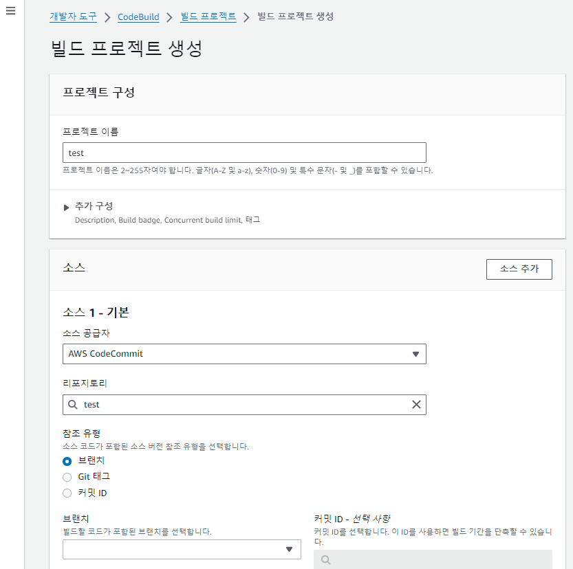 다음으로 CodeBuild를 설정하기 위해 빌드 프로젝트를 생성합니다. 빌드 프로젝트를 생성할 때, 위에 구성한 CodeCommit 리포지토리로 소스 공급자를 지정합니다.