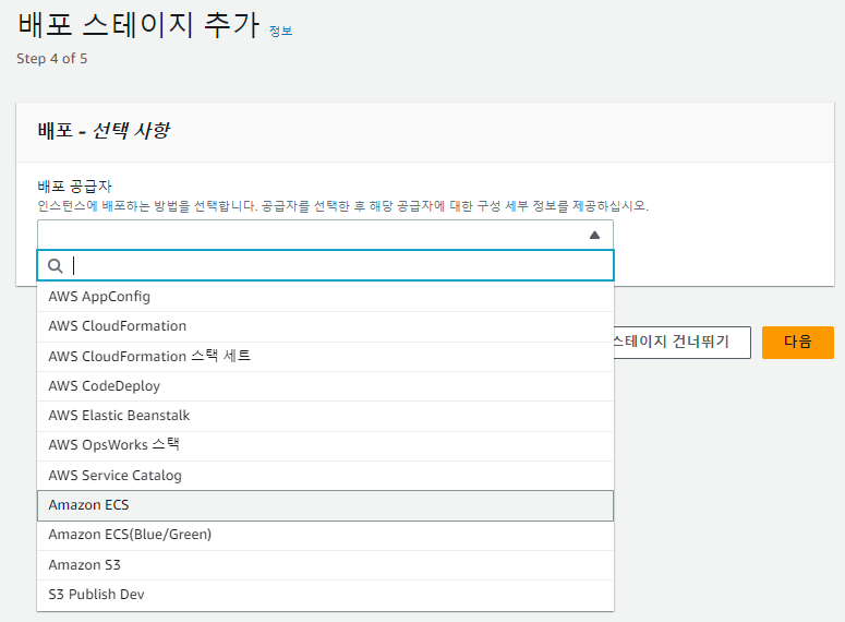 CodeDeploy단계에는 Amazon ECS를 선택합니다. 여기에는 두 가지 방식이 있습니다.