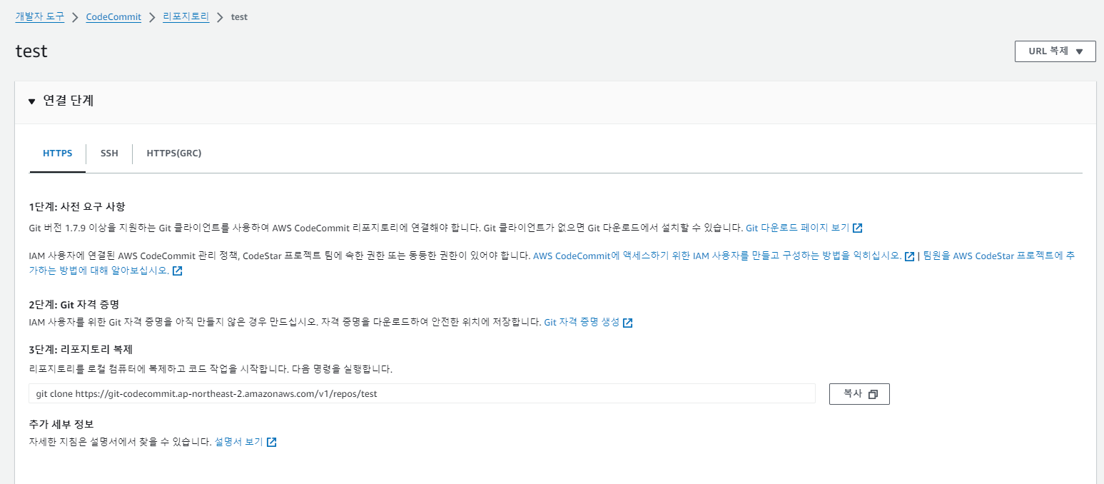 ECR을 만들어 봤기 때문에 CodeCommit은 더 쉽습니다. 다만 내 로컬PC에 git 연동이 필요합니다. 이 과정은 CodeCommit 리포지토리를 생성할 때 AWS콘솔에서 가이드가 제공됩니다.
