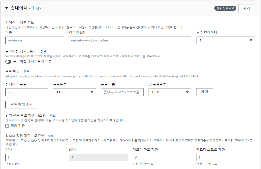 컨테이너 세부 정보와 컨테이너 포트 매핑 정도만 설정하고, 태스크 정의를 생성합니다.