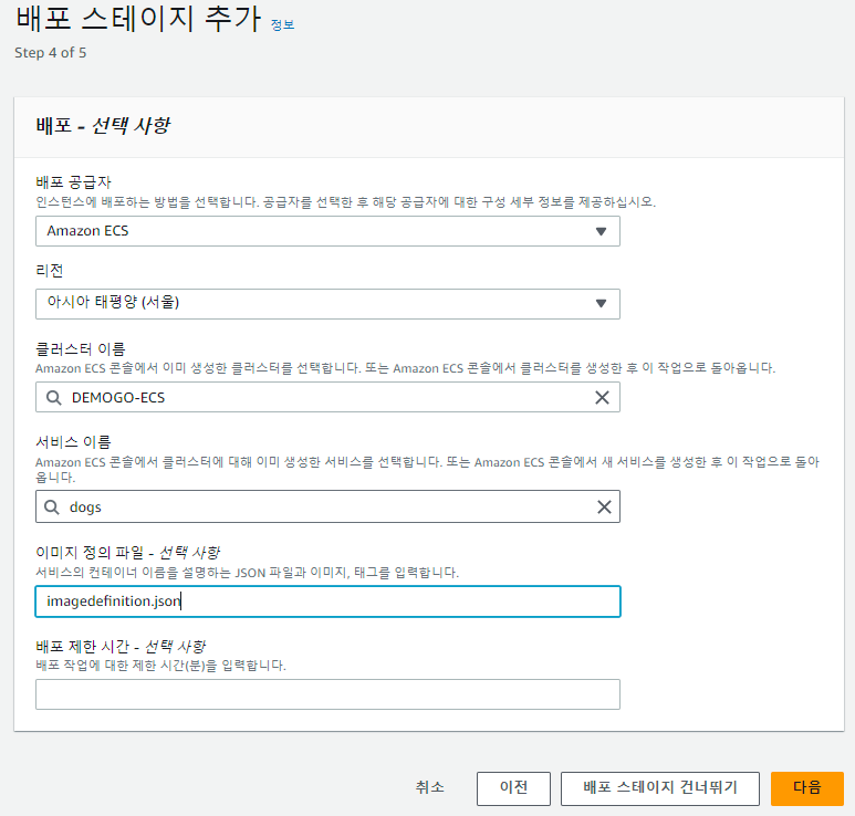아래 배포 스테이지를 구성할 때, Build단계에서 지정한 Imagedefinition.json파일을 정의해야 합니다.