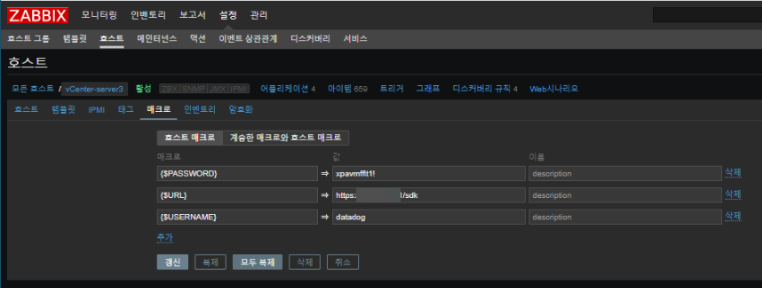 마지막으로 (나머지는 무시해도 됩니다) "매크로"항목에서 vCenter Server 접속 계정을 지정합니다.