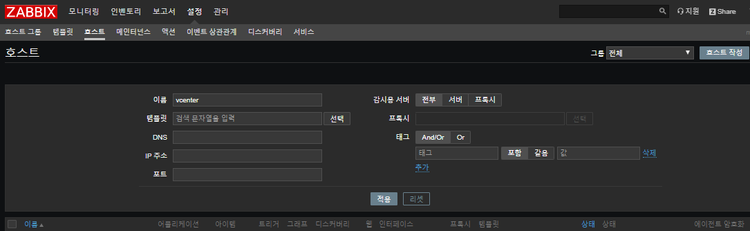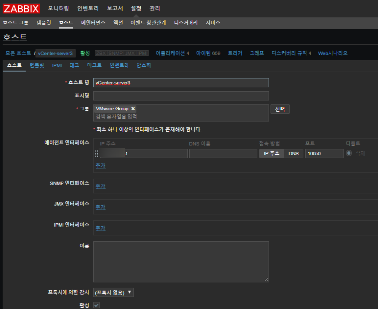 에이전트 인터페이스에 vCenter Server IP를 입력해 줍니다. Zabbix Server OS hosts 파일에 DNS 설정이 지정되어 있으면 FQDN으로 넣어주어도 됩니다. 그룹 항목에도 문자열을 입력하면 자동으로 그룹이 생성됩니다.
