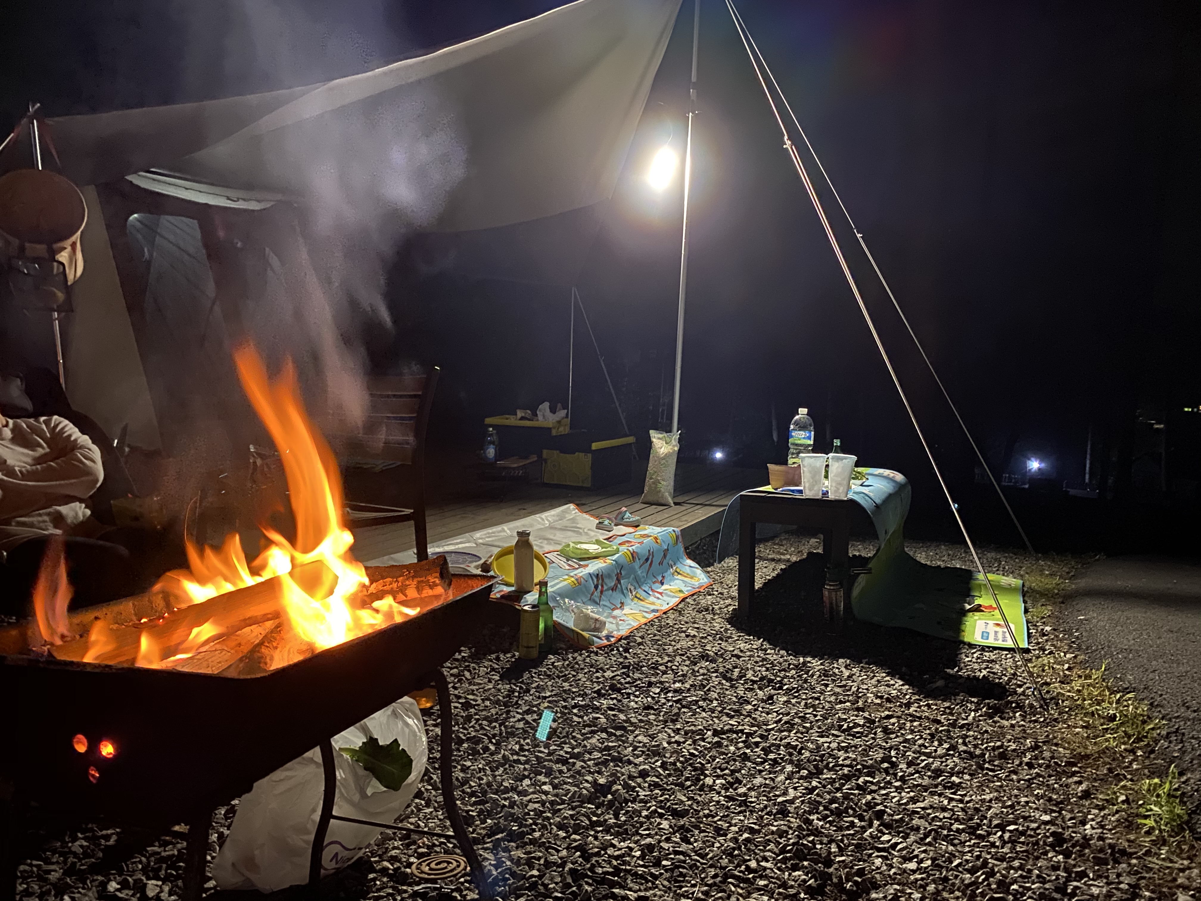캠핑을 시작하고 처음으로 그릴에서 고기를 구웠는데, 솟아오르는 연기와 랜턴 불빛이 감성캠핑의 끝판왕이었습니다. 이 것을 보려고 캠핑하는 것 같아요.