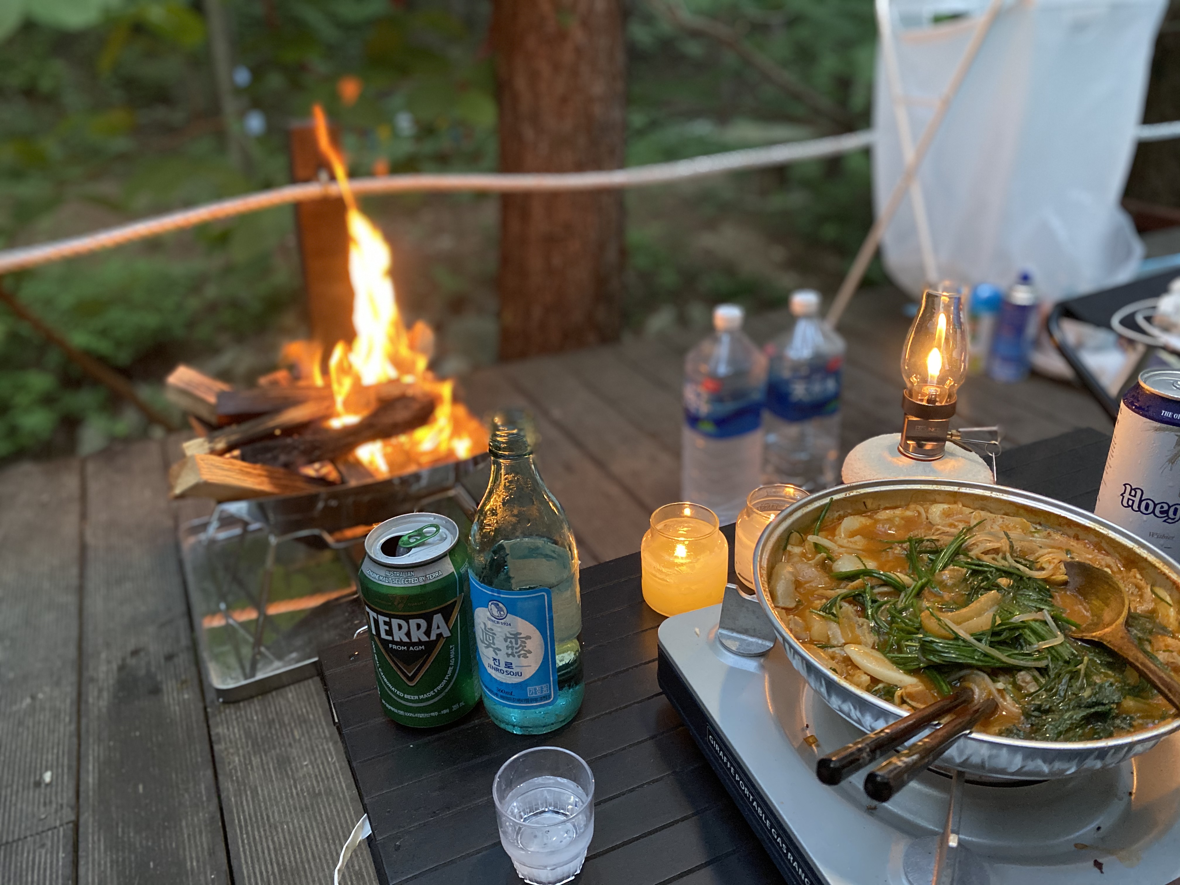 불멍하면서 곱창전골에 쏘맥은 감성캠핑의 하이라이트라 할 수 있고, 지난 시간 동안 다녔던 호캉스와는 비교를 할 수 없는 힐링을 주었습니다.