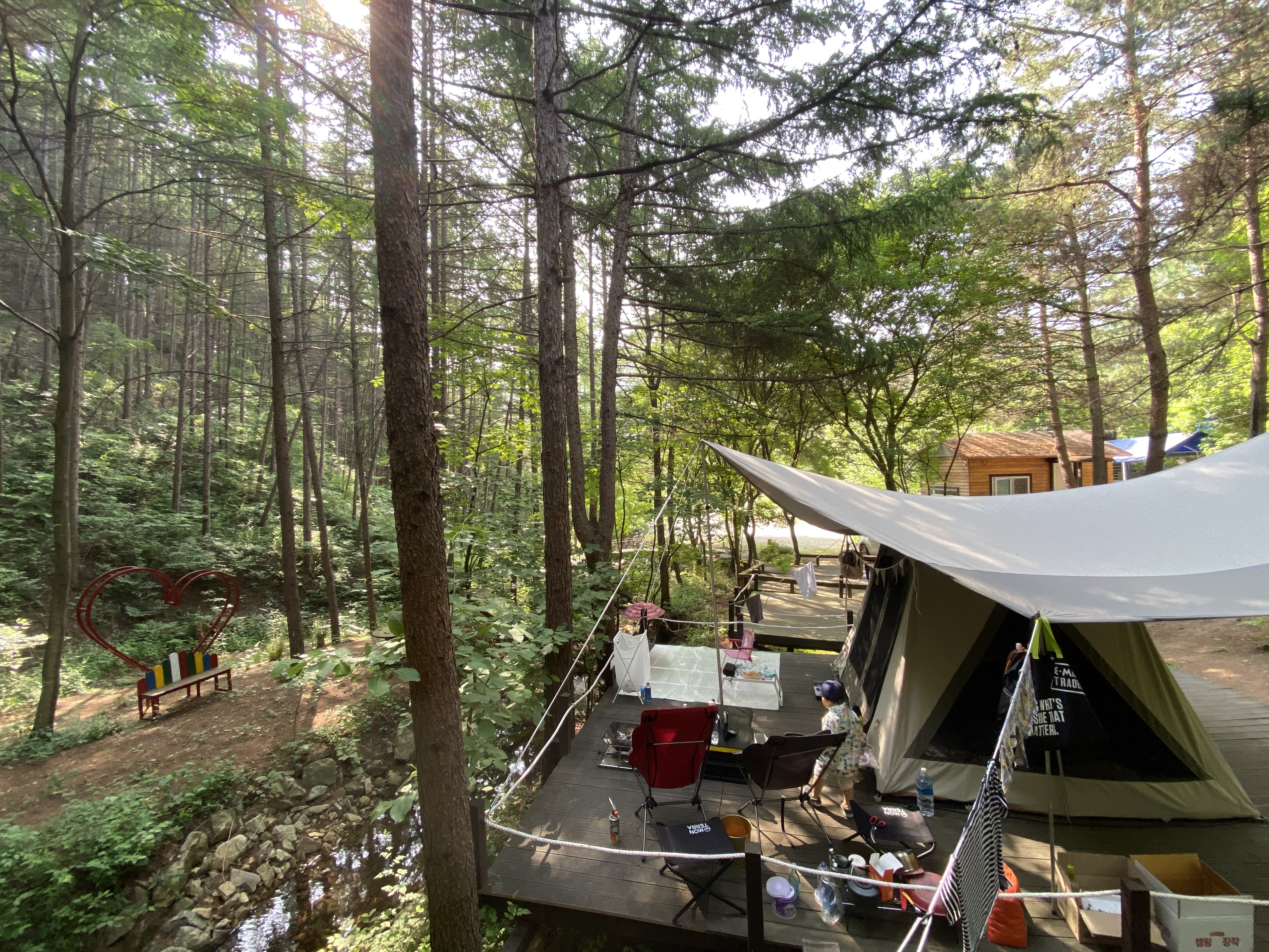 하늘그린 캠핑장은 숲 속에 있는 캠핑장으로 근처 시내에서 더워서 땀이 삐질삐질 났는데, 캠핑장은 시원한 바람이 불어 캠핑하기 딱 좋은 캠핑장이었고, 토요일~월요일 캠핑이라 두 번째 날은 전세 캠핑을 하였습니다.