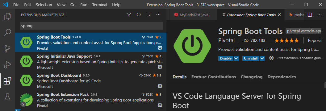 (2) VSCode에서 좌측 Extensions 메뉴를 통해 Spring Boot Tools 설치