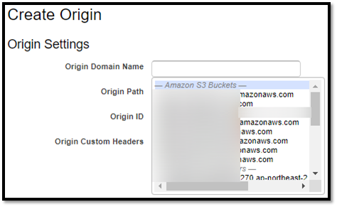 - Origin Domain Name의 블랭크를 선택하면 지정할 수 있는 항목들이 나옵니다. 새로 만든 S3버킷을 선택