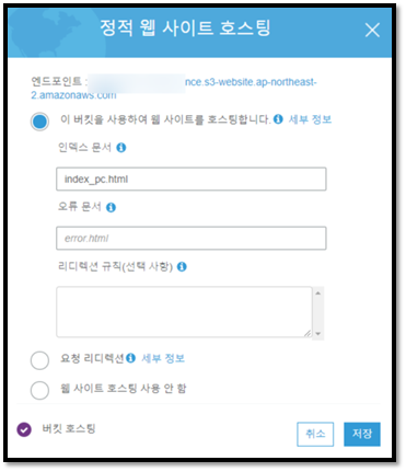 (2) 버킷 속성의 "정적 웹 사이트 호스팅"에서 HTML 파일 명(index_pc.html)을 입력 후 저장