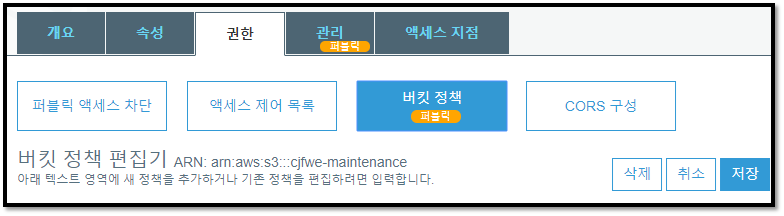 (3) S3 버킷 권한의 "버킷 정책"에 아래 코드 입력 후 저장