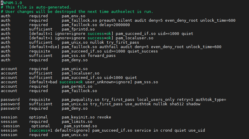 보안 설정에서 /etc/pam.d/ 이하 system-auth 설정으로 계정 보안 설정이 필요했으나, 8버전 부터 해당 설정 파일을 수동으로 변경하기보다 명령어를 통해 변경하는 것을 권장한다고 합니다.