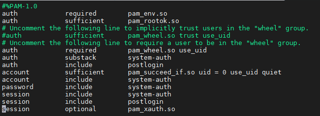 # /etc/pam.d/su 파일에 주석 처리되어 있는 아래 부분 주석 해제