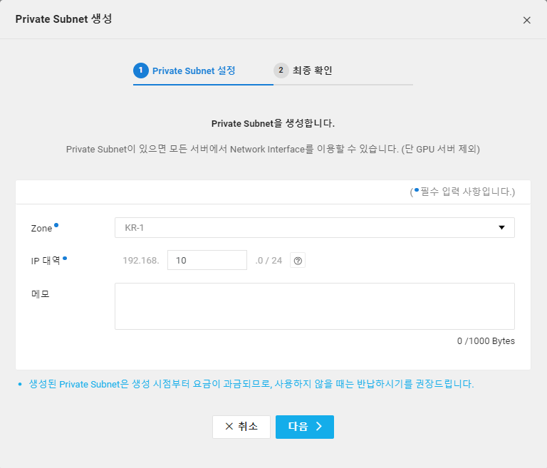 (3) Private Subnet 생성을 위한 Zone, IP대역 설정